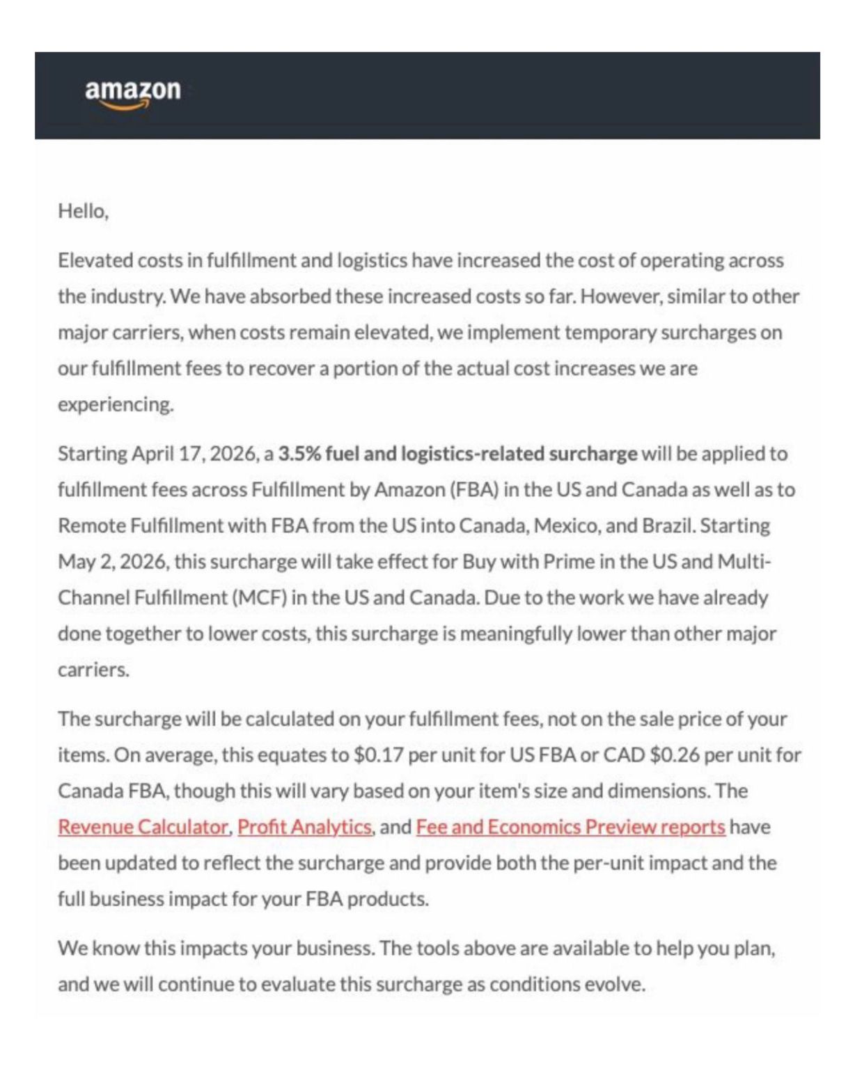 Amazon has officially announced a 3.5% fuel and logistics surcharge on fulfillment fees, and while the percentage may seem small at first glance, the impact on sellers is more meaningful than it appears.
